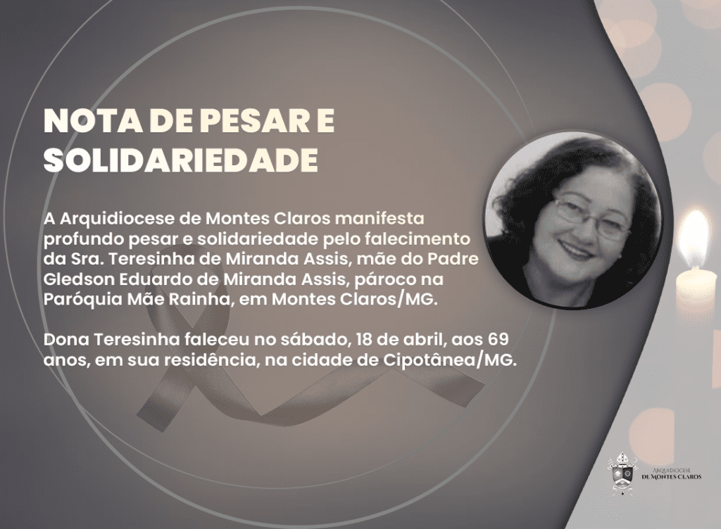 A Arquidiocese de Montes Claros manifesta profundo pesar e solidariedade pelo falecimento da Sra. Teresinha de Miranda Assis, mãe do Padre Gledson Eduardo de Miranda Assis, pároco na Paróquia Mãe Rainha, em Montes Claros/MG. Dona Teresinha faleceu no sábado, 18 de abril, aos 69 anos, em sua residência, na cidade de Cipotânea/MG. Ela estava em […]