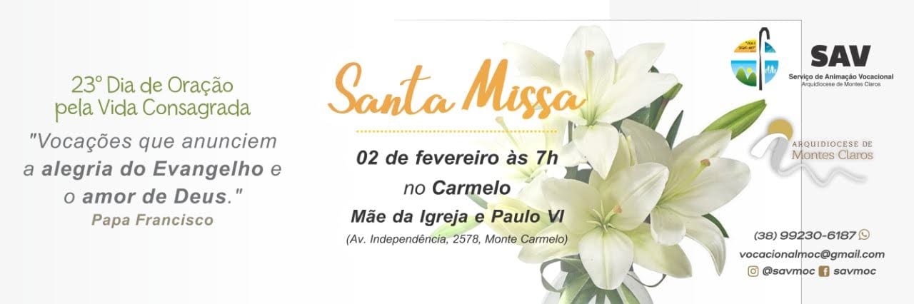 O Serviço de Animação Vocacional convida a todos para a Santa Missa, dia 02 de fevereiro, ás 07 h, no Carmelo Maria Mãe da Igreja e Paulo VI, pois “as vocações nascem e florescem numa Igreja que reza” (Papa Francisco).