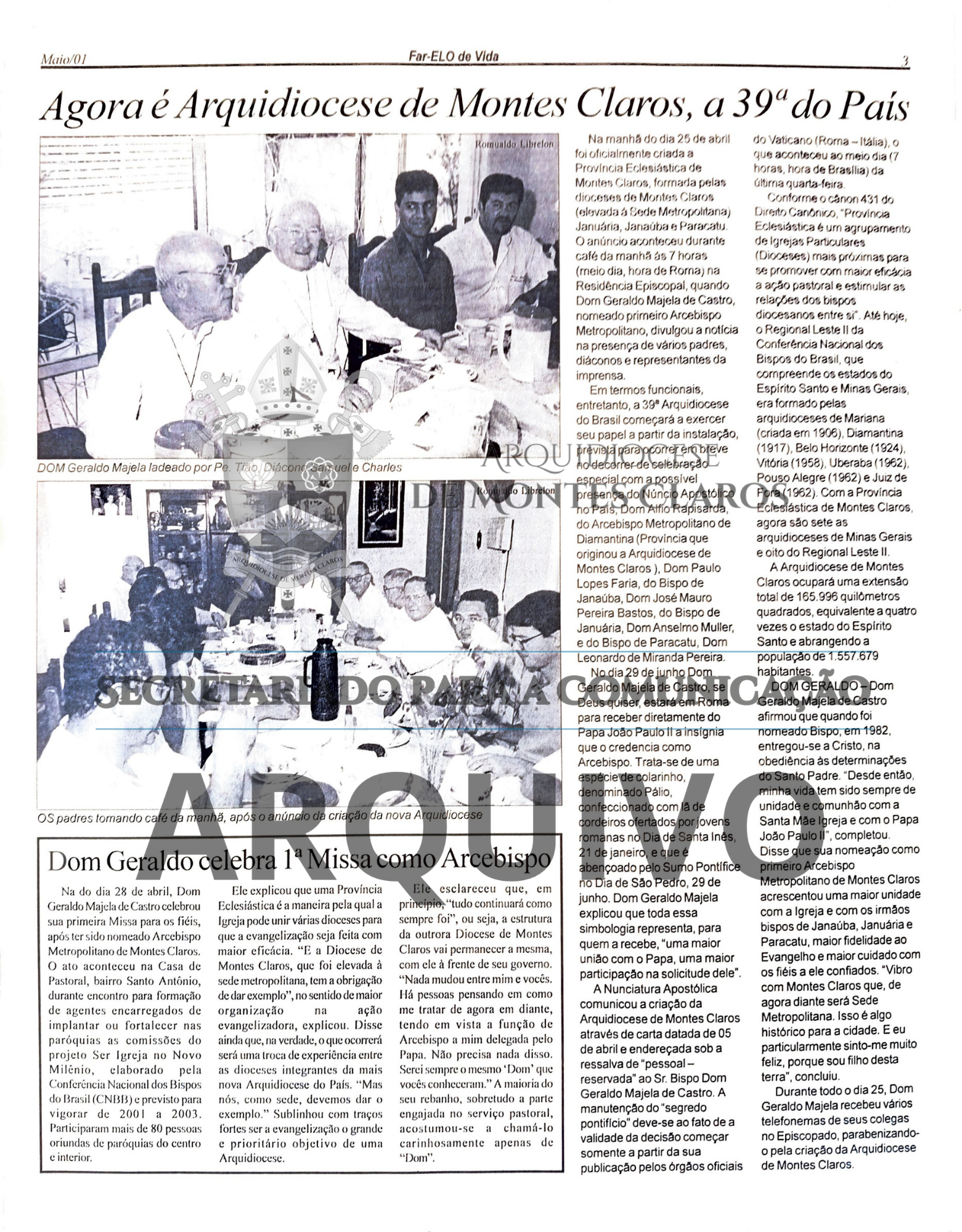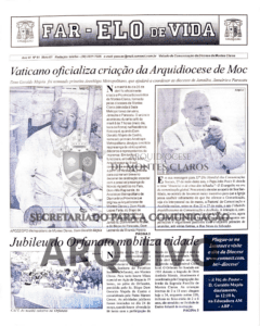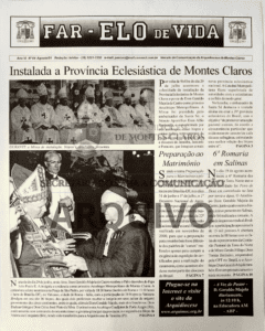 Imagens 1 e 2: Registro histórico publicado no Jornal Diocesano Far-Elo de Vida, edição nº 60, de abril de 2001: anúncio da criação da Arquidiocese de Montes Claros e a primeira Missa de Dom Geraldo Majela de Castro como Arcebispo. Arquivo: Secretariado para a Comunicação – Arquidiocese de Montes Claros.