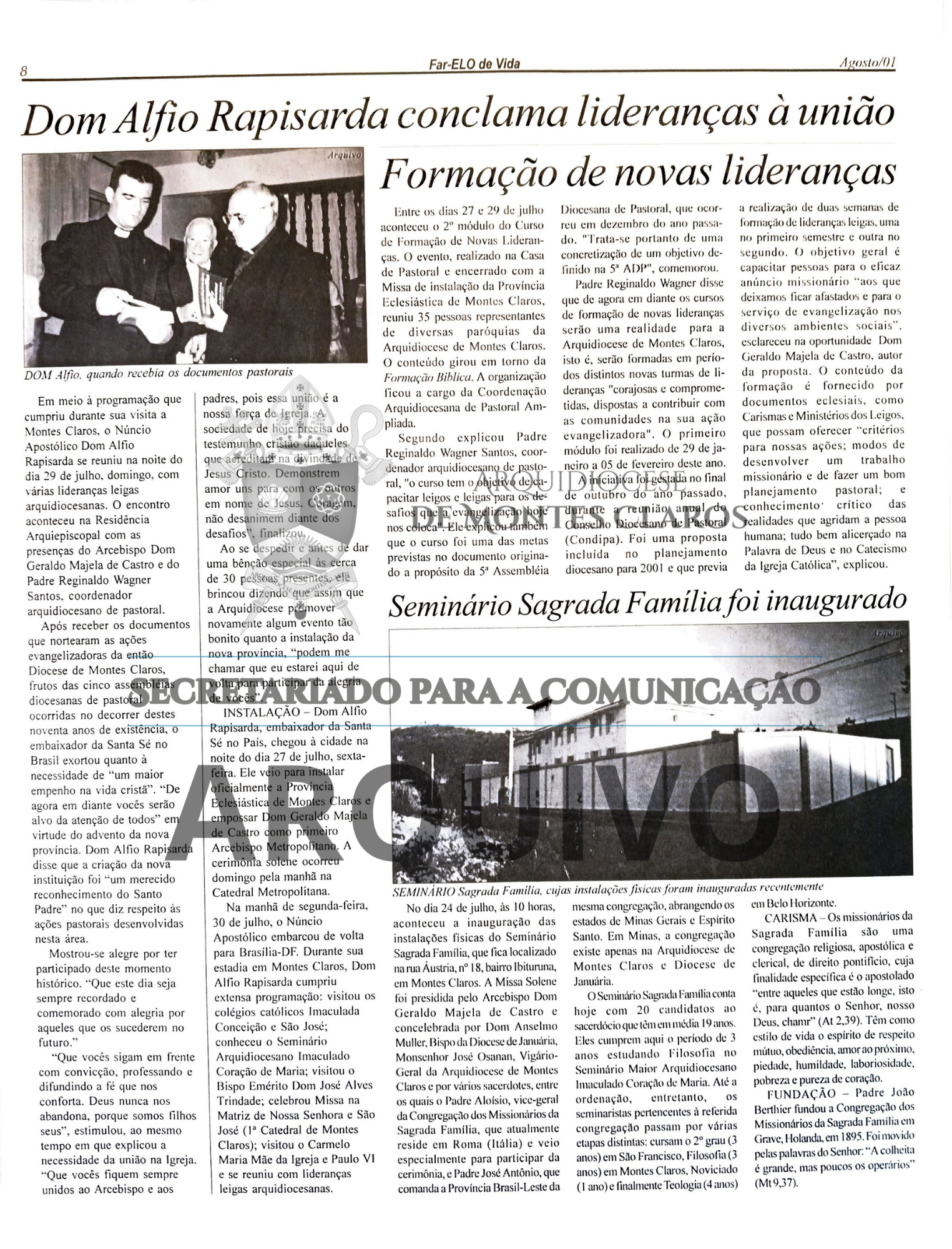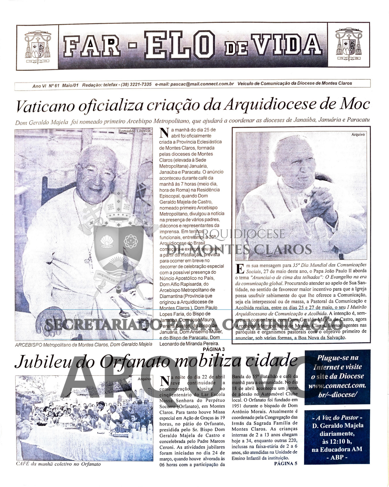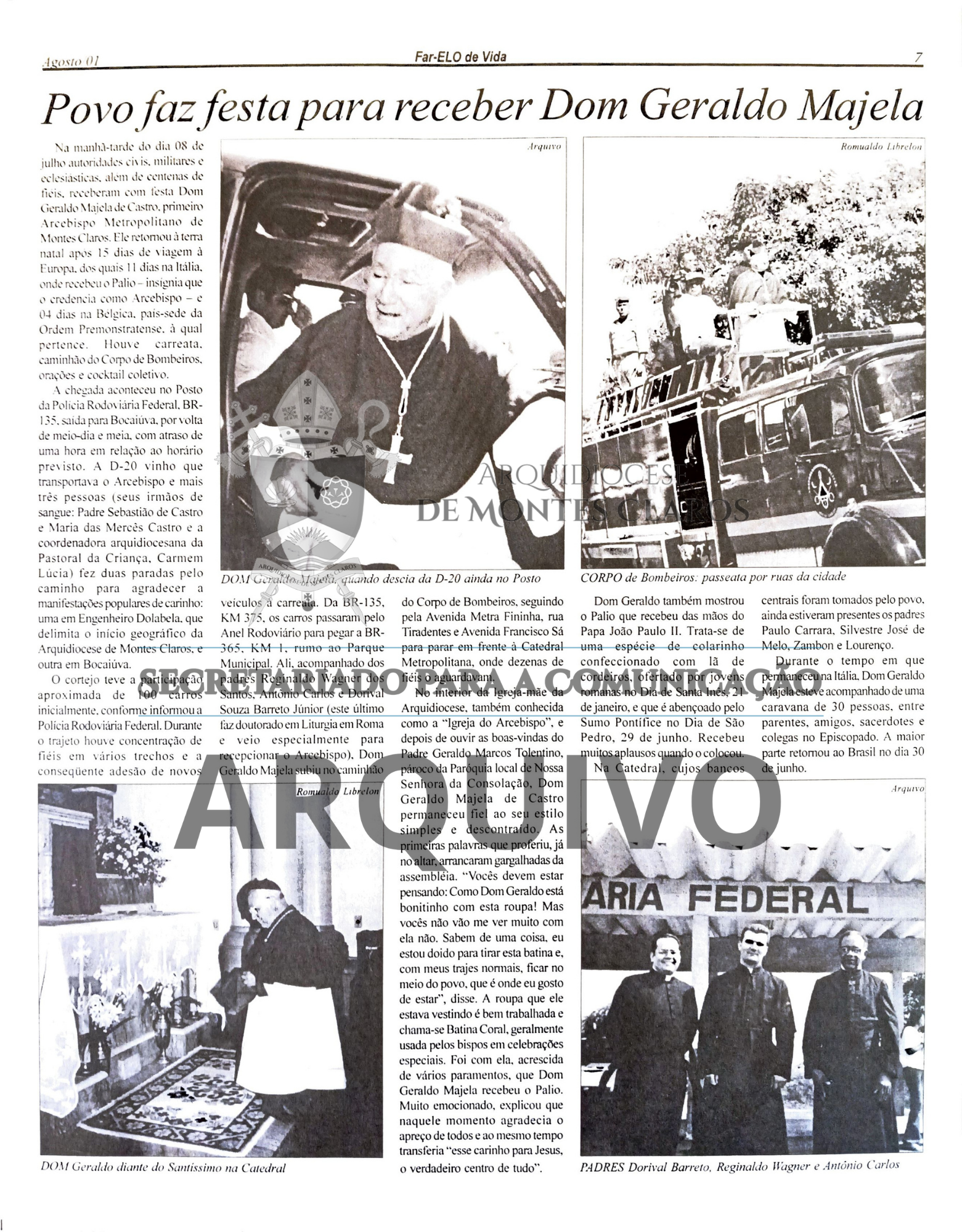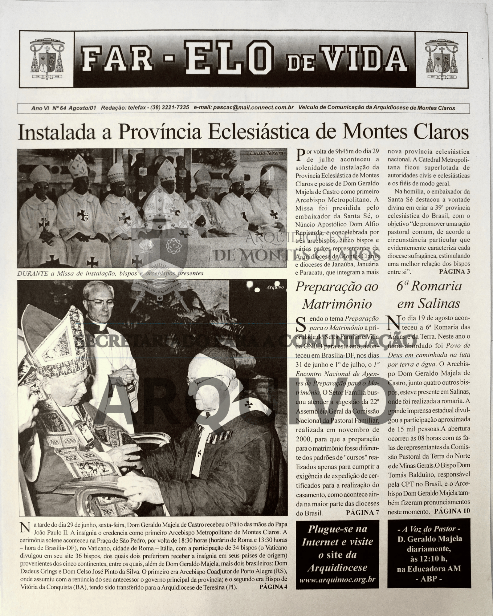 Imagens 8 a 13: Registro histórico publicado no Jornal Arquidiocesano Far-Elo de Vida, edição nº 64, de agosto de 2001: cobertura especial da viagem de Dom Geraldo Majela de Castro a Roma para receber o Pálio das mãos de São João Paulo II, seu retorno a Montes Claros, a instalação da Província Eclesiástica e a visita do Núncio Apostólico Dom Alfio Rapisarda à cidade. Arquivo: Secretariado para a Comunicação - Arquidiocese de Montes Claros.