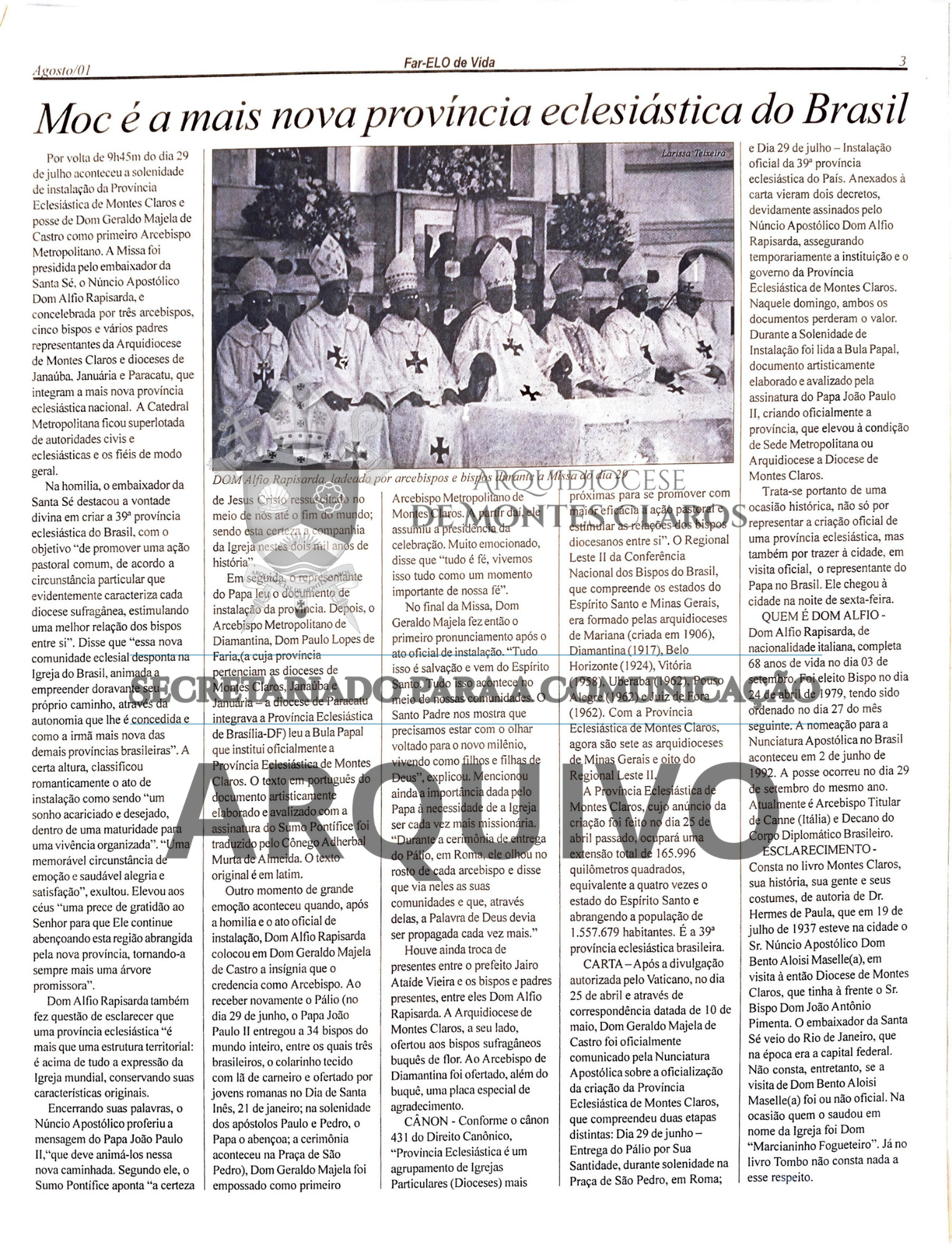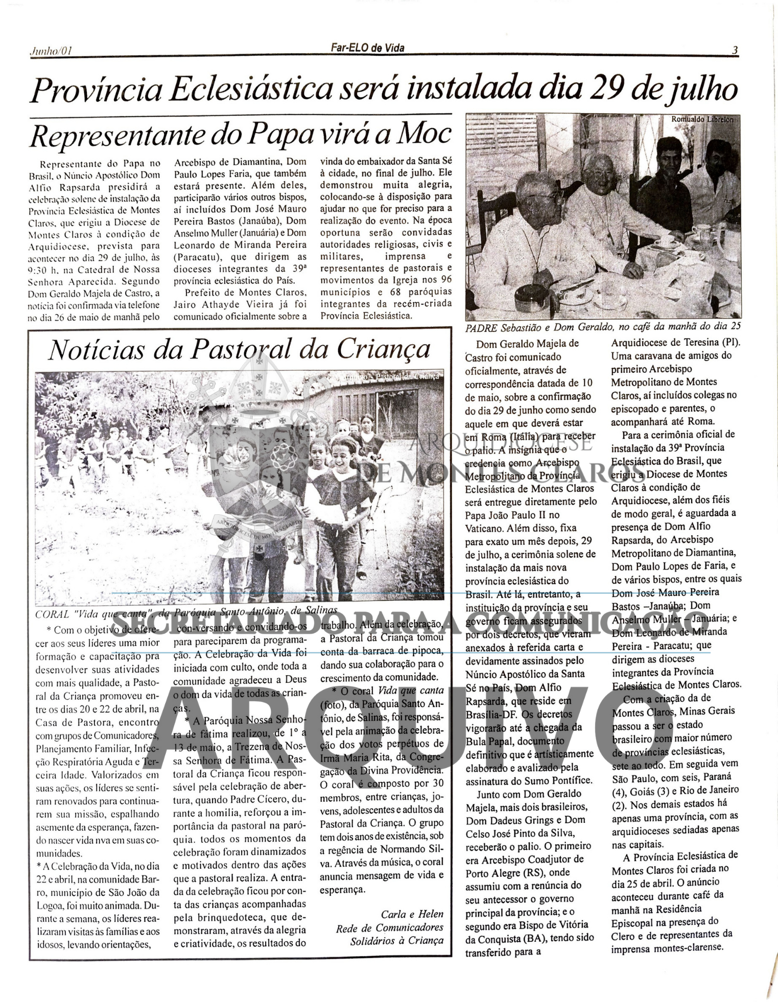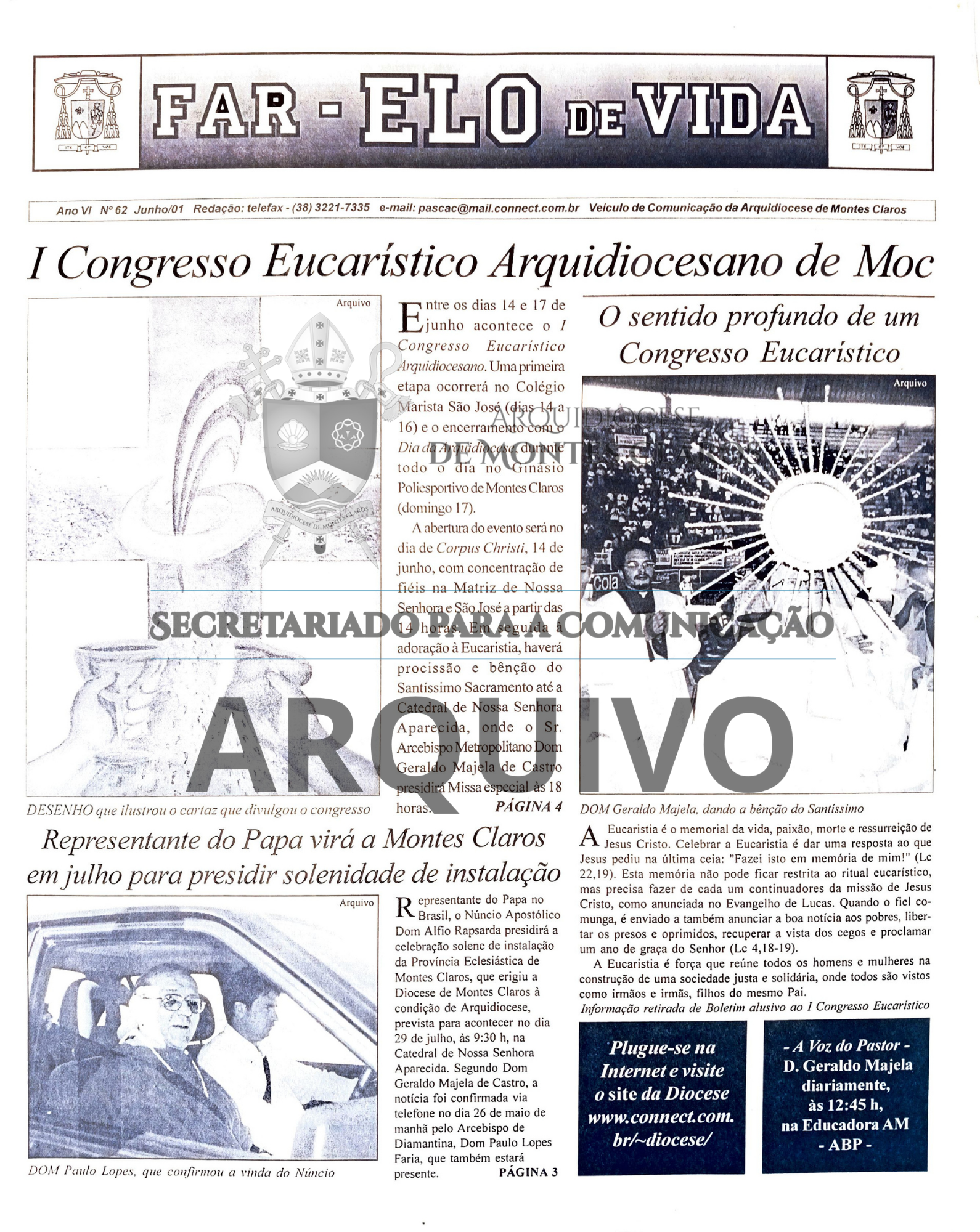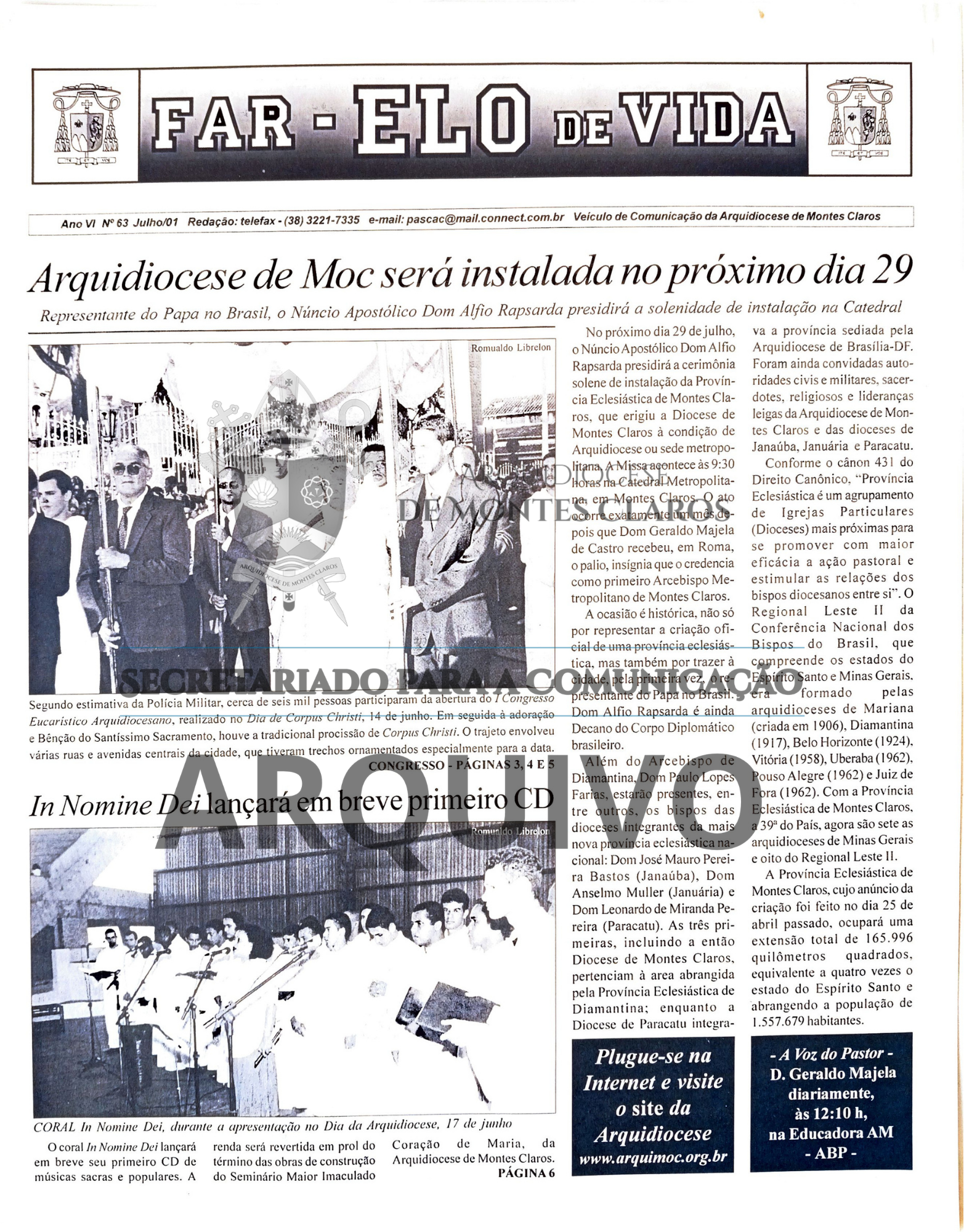 Imagens 5, 6 e 7: Registro histórico publicado no Jornal Arquidiocesano Far-Elo de Vida, edições nº 62, de junho de 2001, e nº 63, de julho de 2001: anúncio da visita do Núncio Apostólico Dom Alfio Rapisarda para a celebração de instalação da Província Eclesiástica de Montes Claros, realizada em 29 de julho de 2001. Arquivo: Secretariado para a Comunicação - Arquidiocese de Montes Claros.