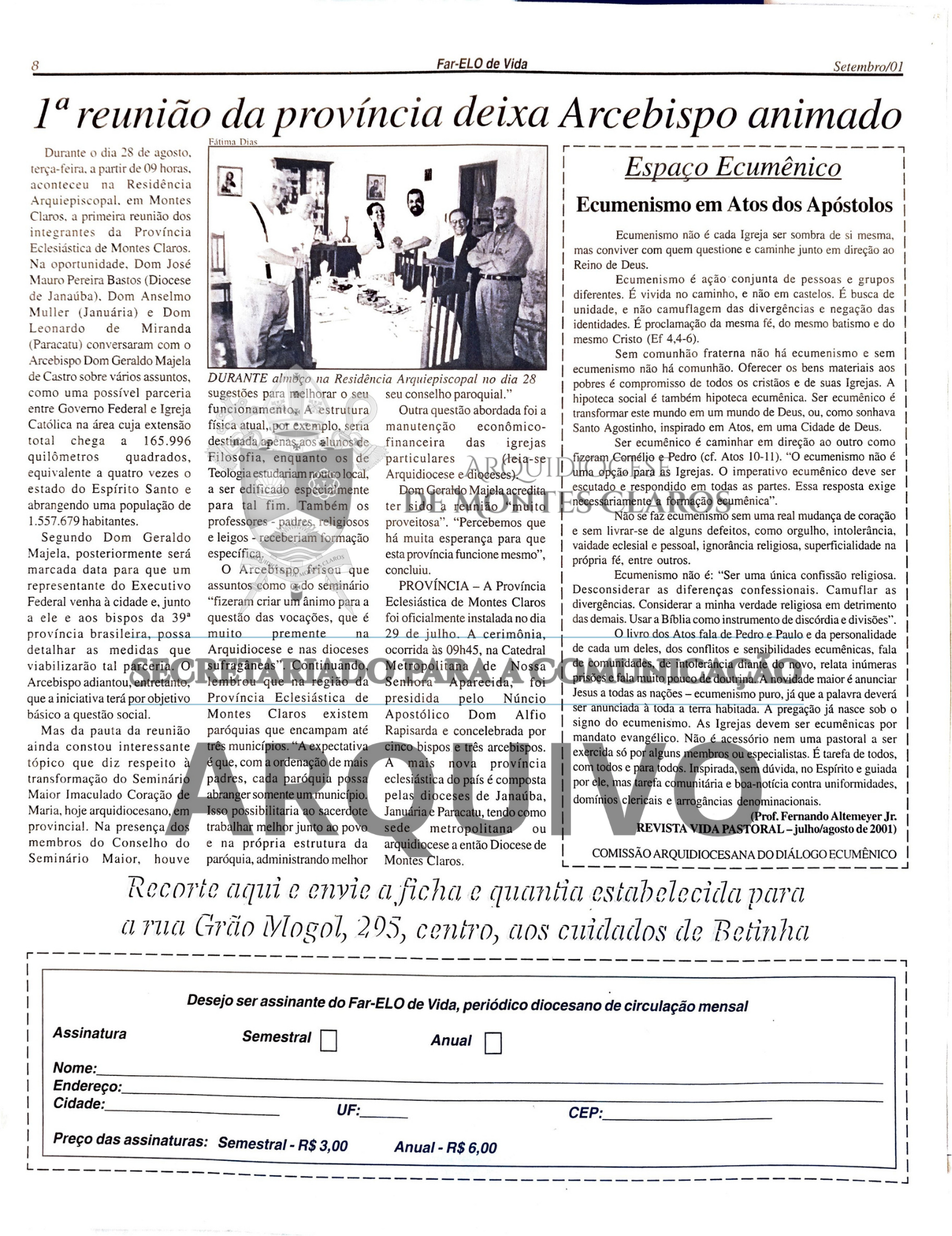 Imagens 14 e 15: Registro histórico publicado no Jornal Arquidiocesano Far-Elo de Vida, edição nº 65, de setembro de 2001, com cobertura especial sobre os acontecimentos marcantes da vida da Arquidiocese de Montes Claros. Arquivo: Secretariado para a Comunicação - Arquidiocese de Montes Claros.