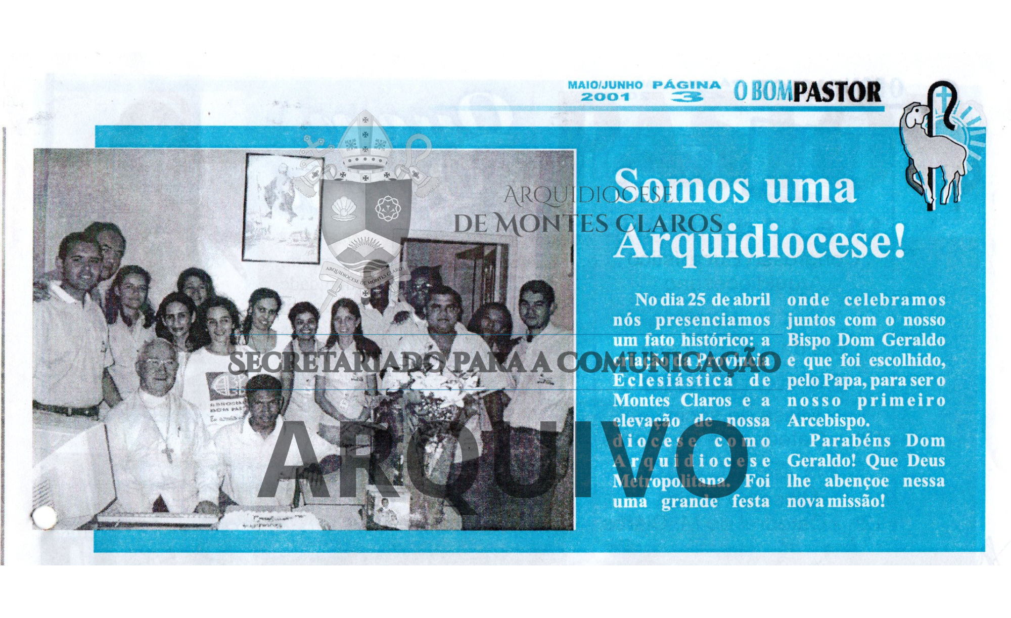 A repercussão desse momento também ficou registrada no Jornal O Bom Pastor, publicação da Associação Bom Pastor. Na edição nº 17, referente aos meses de maio e junho de 2001, o periódico destacou o anúncio da criação da Arquidiocese de Montes Claros realizado na programação especial do dia 25 de abril, trazendo foto de Dom Geraldo Majela de Castro ao lado da equipe da Associação Bom Pastor. O registro confirma o empenho dos meios de comunicação católicos locais em documentar e difundir aquele marco histórico para toda a região.Imagem 4: Registro histórico publicado no Jornal O Bom Pastor, edição nº 17, de maio e junho de 2001: anúncio da criação da Arquidiocese de Montes Claros na programação da Associação Bom Pastor, com foto de Dom Geraldo Majela de Castro e da equipe da Associação Bom Pastor no dia 25 de abril. Arquivo: Secretariado para a Comunicação – Arquidiocese de Montes Claros.