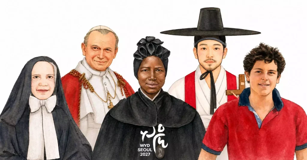 Para a JMJ Seul 2027, os santos foram selecionados à luz dos temas espirituais do evento: verdade, amor e paz. Os cinco Santos Patronos da JMJ Seul 2027 são: