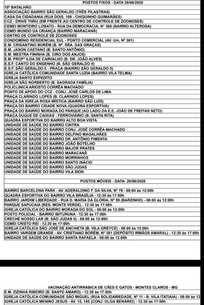 Devido a pandemia do COVID-19, houve a necessidade de adequar a campanha e realizar em duas etapas, na zona urbana e na zona rural. Na zona urbana, a vacinação será realizada por região. Dia 22 de agosto, na região Norte da cidade de Montes Claros, e no dia 29 de agosto, na região Sul, no horário de 8:00 às 17:00. Para garantir uma ampla cobertura, serão disponibilizados 78 postos fixos e 11 postos móveis na cidade. Vale destacar que, em frente ao CCZ, a vacinação será feita pelo sistema drive-thru.
