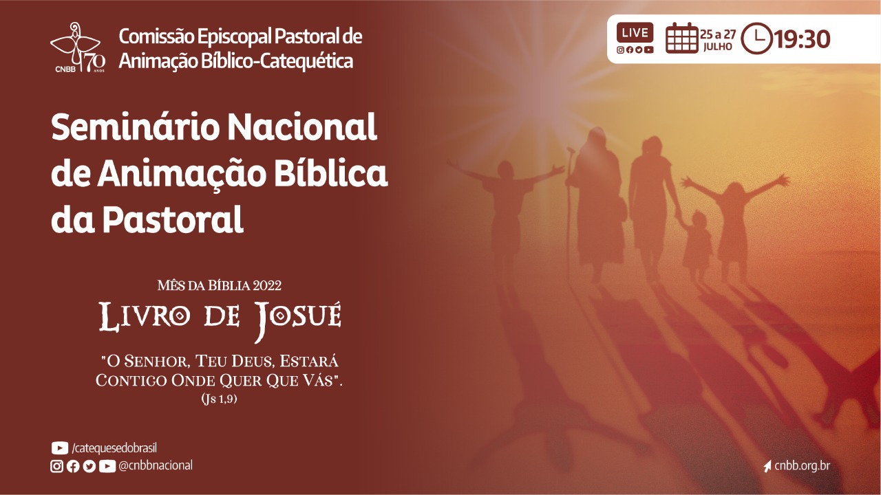 A Comissão para a Animação Bíblico-Catequética da Conferência Nacional dos Bispos do Brasil (CNBB) organiza mais um espaço de reflexão e divulgação sobre a Animação Bíblica da Pastoral. Trata-se de um seminário nacional, que irá ocorrer nos dias 25 a 27 de julho, de forma online, com transmissão pelo YouTube, nos canais da CNBB: CNBB Nacional, Edições CNBB e Catequese do Brasil.