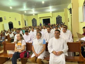 Após a celebração, houve um café de confraternização com os seminaristas, seguido por uma reunião de alinhamento da programação, onde foram definidos os detalhes e ajustes finais para as atividades da semana. Esse momento inicial foi fundamental para preparar os missionários e estabelecer a unidade necessária para o êxito da missão. (Clique aqui e confira mais fotos da Missa de Envio.)