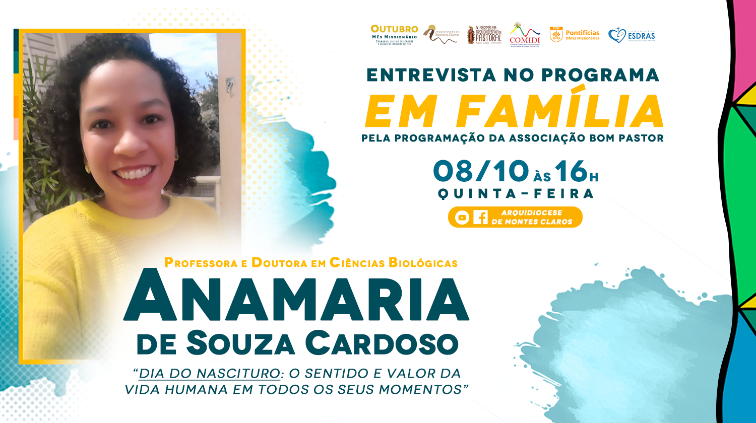 Entrevista com a professora Anamaria de Souza Cardoso irá conduzir reflexão sobre o Dia do Nascituro, dentro da programação da Semana da Vida na Arquidiocese de Montes Claros. O bate papo será no Programa “Em Família”, no dia 08 de outubro, às 16h, na Programação da Associação Bom Pastor – Rádio Terra, e poderá ser acompanhada também pelo Facebook e Youtube da Arquidiocese.