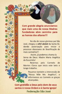 Ao final da celebração, Dom José Carlos partilhou com a assembleia uma notícia que encheu de júbilo não apenas o Carmelo, mas toda a Igreja particular de Montes Claros. Recordando a Solenidade de São José, celebrada no dia 19 de março, o arcebispo anunciou que, nesta data tão significativa, chegou da Santa Sé o nihil obstat, autorizando oficialmente a abertura do processo diocesano de beatificação da Madre Maria Angélica da Eucaristia, madre fundadora do Carmelo Maria Mãe da Igreja e Paulo VI.