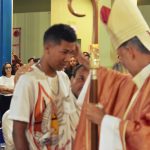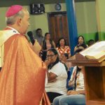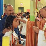 Às 18h00, Dom José Carlos, presidiu a celebração da Missa, onde 63 jovens e adultos, preparados pela catequese da paróquia, receberam o sacramento da Crisma.