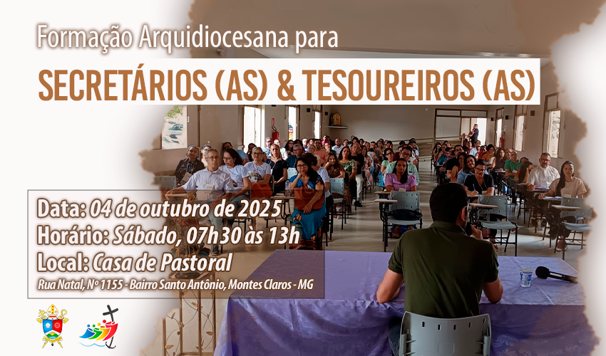 A Arquidiocese de Montes Claros promoverá, no dia 04 de outubro (sábado), o Encontro Arquidiocesano de Formação para Secretários(as) e Tesoureiros(as) das paróquias, setores administrativos da Arquidiocese e Seminário. O momento tem como objetivo fortalecer a missão de serviço administrativo e pastoral, promovendo maior integração, clareza e responsabilidade no exercício das funções.