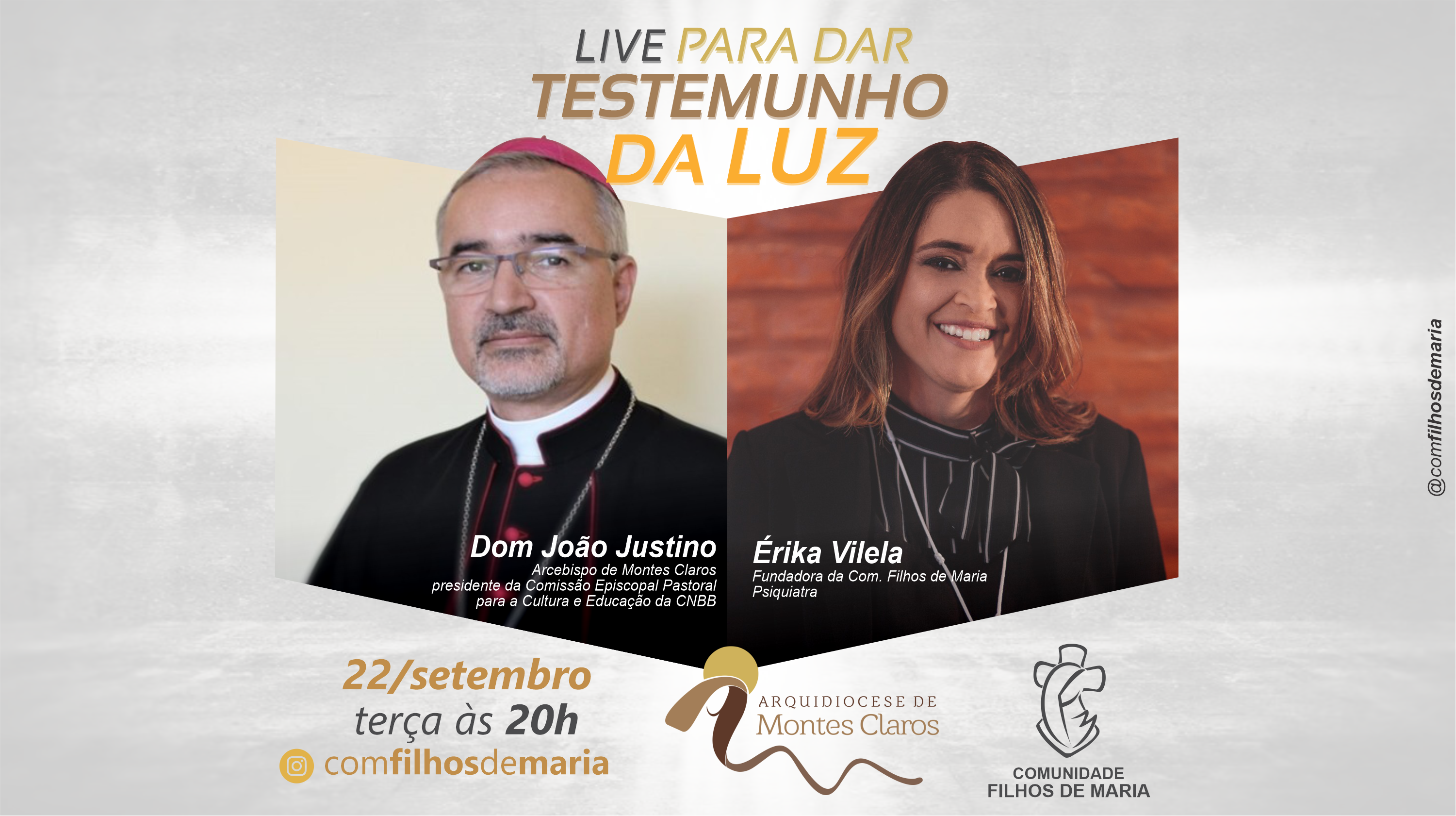 Dom João Justino, Arcebispo de Montes Claros, participa de live com o tema “Para dar testemunho da Luz”. O bate-papo será com Erika Vilela, fundadora da Comunidade Filhos de Maria, no dia 22 de setembro, terça-feira, às 20h pelo Instagram da Comunidade Filhos de Maria. (Clique aqui.)