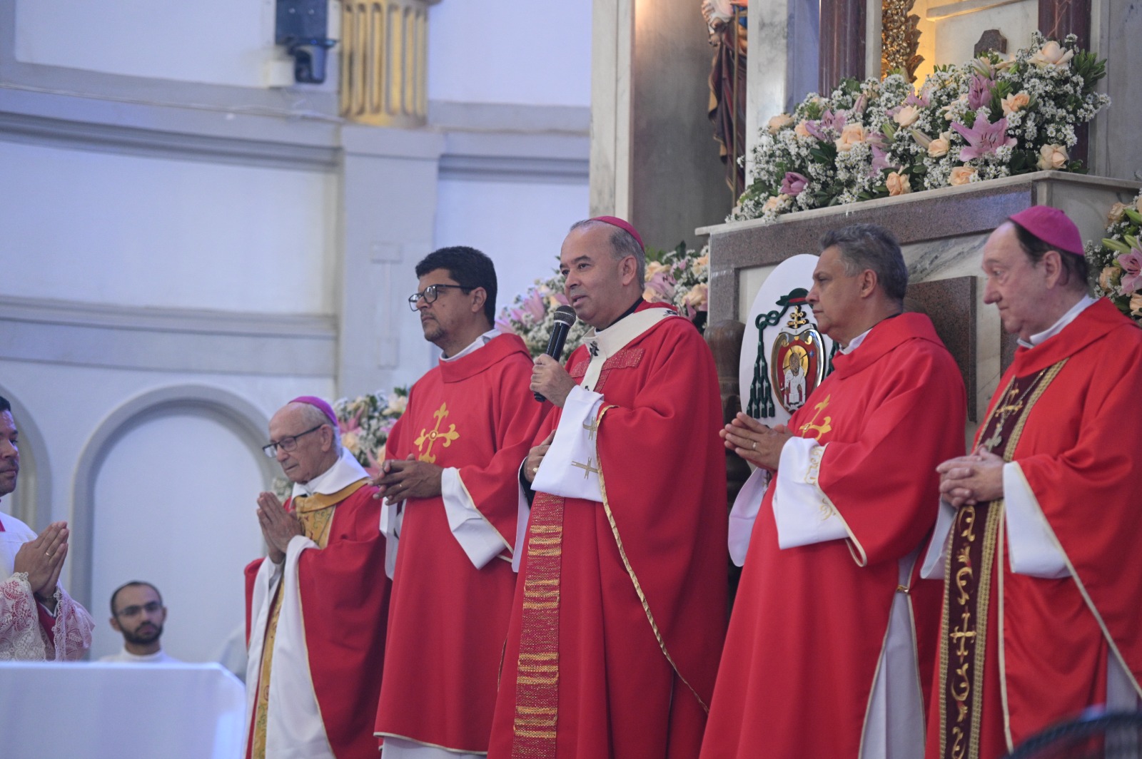 Em seguida, Dom José Carlos recordou a proteção materna de Nossa Senhora Mãe da Igreja, padroeira principal da Arquidiocese, incentivando os fiéis a divulgarem e cultivarem essa devoção. “Estamos consagrados a ela. É ela quem cuida de nós e que nos acompanha do céu, tendo-nos debaixo também do seu manto.”
