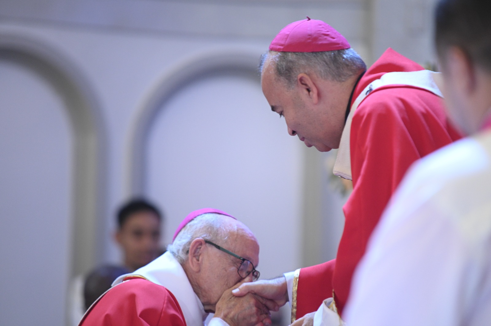 Em seguida, após pedir calorosas palmas para Dom José Alberto Moura e para Dom José Carlos de Souza Campos, o bispo emérito de Paracatu protagonizou um dos momentos mais comoventes da celebração. Aproximando-se de Dom José Carlos, Dom Leonardo o abraçou fraternalmente e, em gesto de profunda simplicidade e comunhão eclesial, pediu-lhe a bênção diante de toda a assembleia.