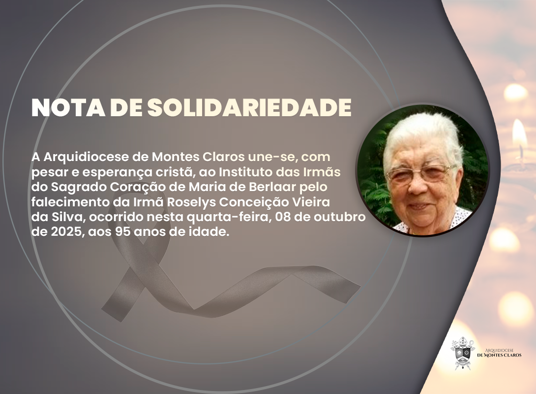 A Arquidiocese de Montes Claros une-se, com pesar e esperança cristã, ao Instituto das Irmãs do Sagrado Coração de Maria de Berlaar pelo falecimento da Irmã Roselys Conceição Vieira da Silva, ocorrido nesta quarta-feira, 08 de outubro de 2025, aos 95 anos de idade.