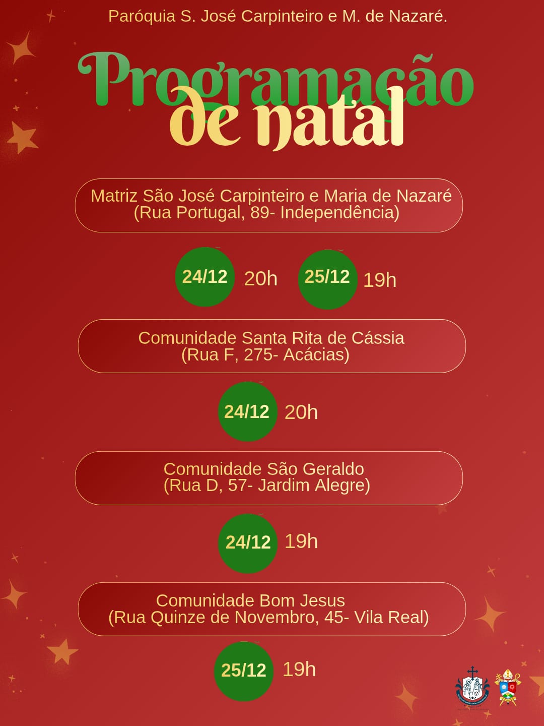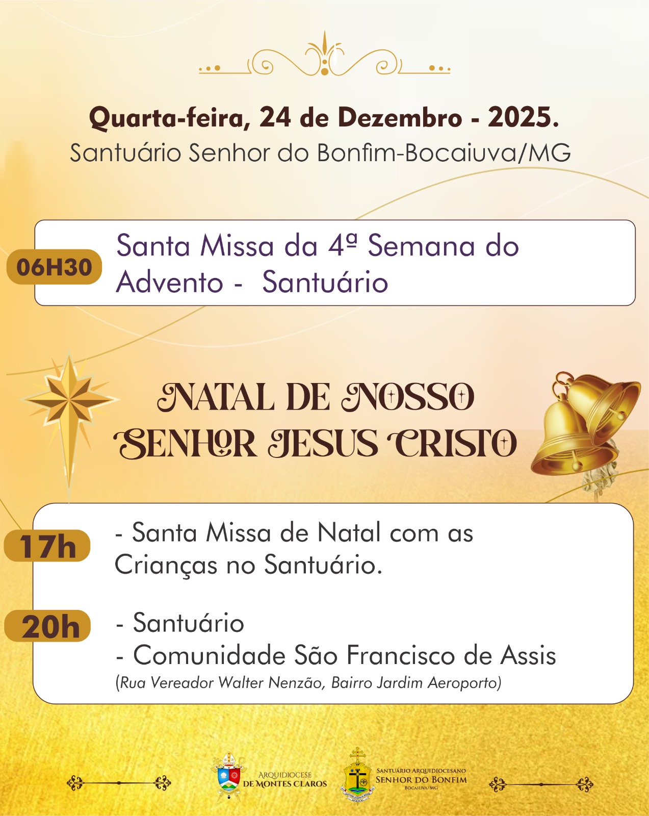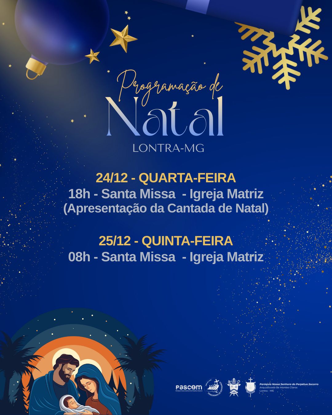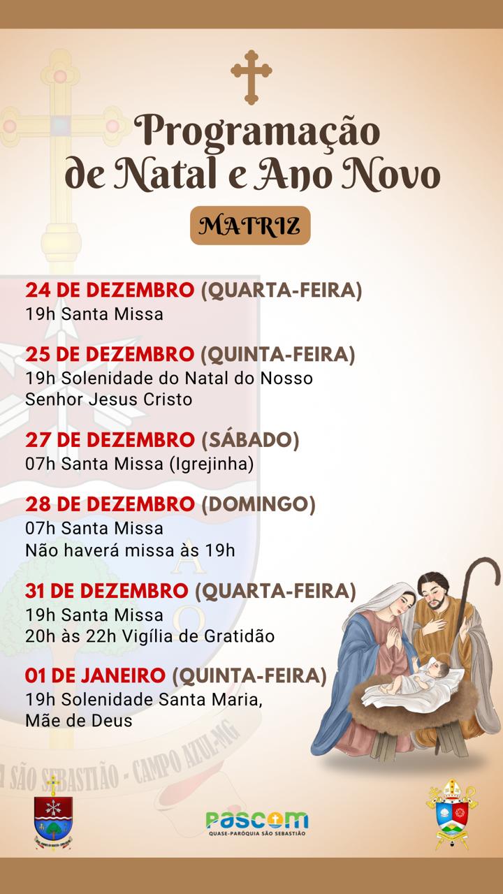 Em comunhão com toda a Igreja, a Arquidiocese de Montes Claros convida os fiéis a participarem das celebrações natalinas em suas paróquias e comunidades. Abaixo, disponibilizamos a programação completa das Missas dos dias 24 e 25 de dezembro, organizadas por paróquia e cidade, para que todos possam se unir na celebração deste mistério de fé, amor e salvação.
