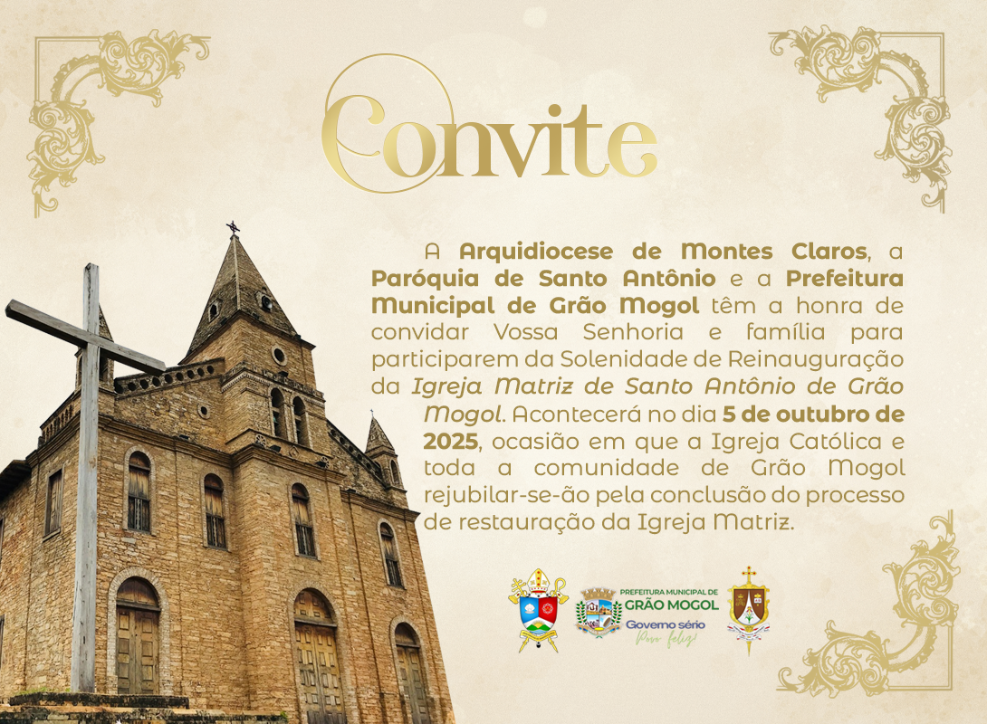 A Arquidiocese de Montes Claros, a Paróquia Santo Antônio de Grão Mogol e a Prefeitura Municipal de Grão Mogol têm a honra de convidar todos os fiéis e a comunidade em geral para a solenidade de reinauguração da Igreja Matriz de Santo Antônio, no dia 5 de outubro de 2025.