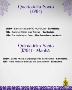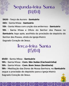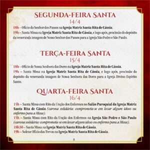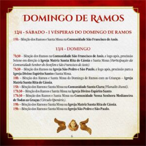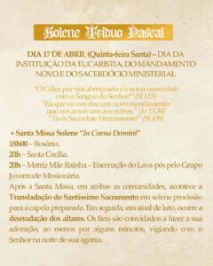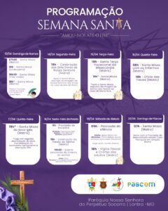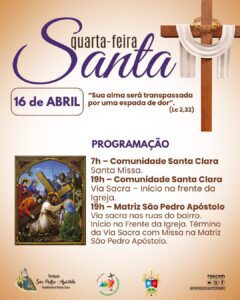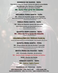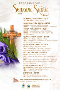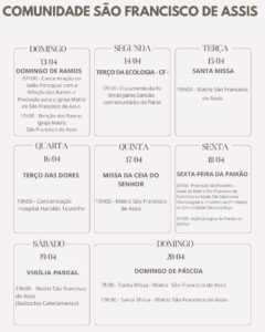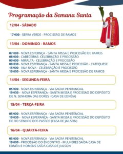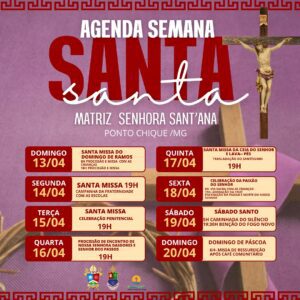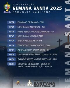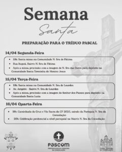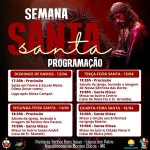 A Semana Santa é o ponto alto do ano litúrgico da Igreja. É o tempo em que os cristãos são convidados a acompanhar mais de perto os últimos passos de Jesus: sua entrada triunfal em Jerusalém, a instituição da Eucaristia, sua paixão e morte na cruz, e, finalmente, a vitória da vida sobre a morte na ressurreição. Cada celebração dessa semana nos conduz a um encontro mais profundo com o amor de Deus, manifestado em Cristo.