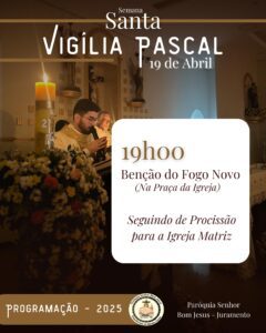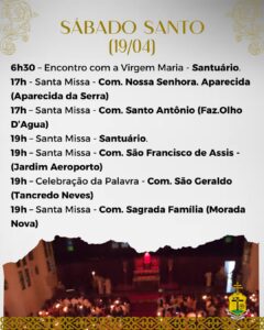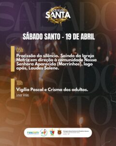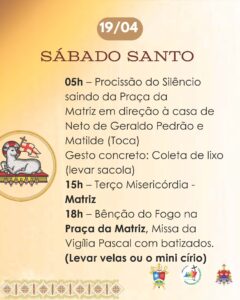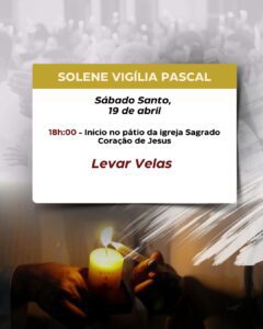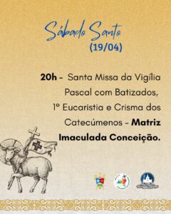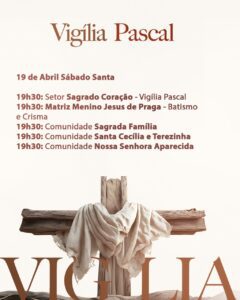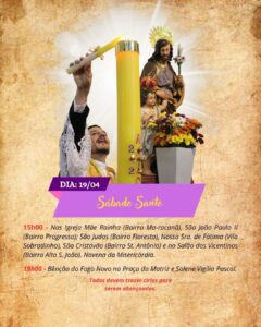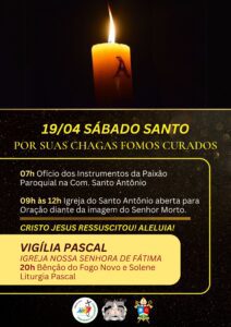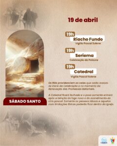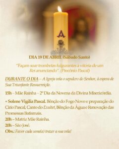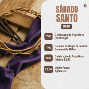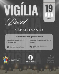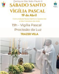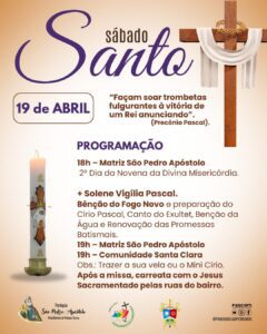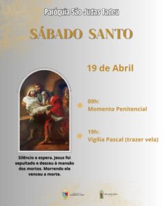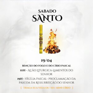 O Sábado Santo é marcado pelo silêncio e pela espera. A Igreja permanece junto ao sepulcro do Senhor, meditando sobre sua paixão e morte, e aguardando, com esperança, o anúncio da ressurreição. É um dia de oração discreta, que culmina à noite com a Vigília Pascal, considerada a mãe de todas as celebrações. Nessa liturgia solene, celebramos a luz que vence as trevas, ouvimos com atenção a história da salvação, renovamos nossas promessas batismais e proclamamos com alegria: “Cristo ressuscitou, aleluia!”.