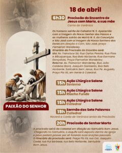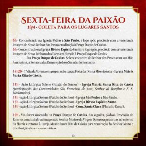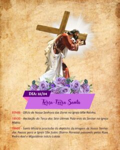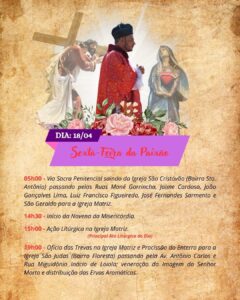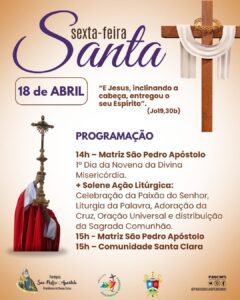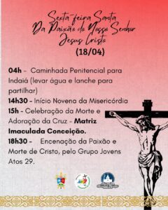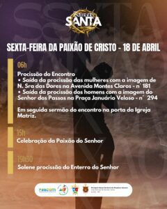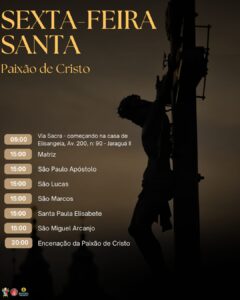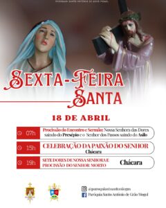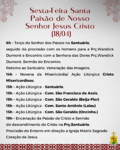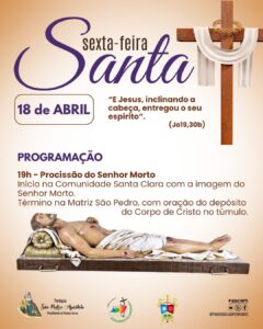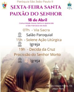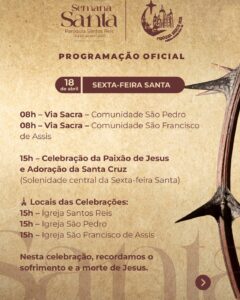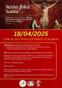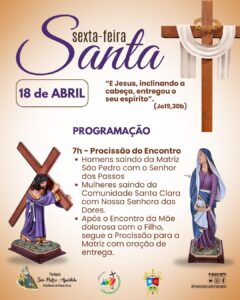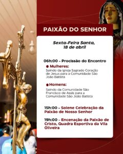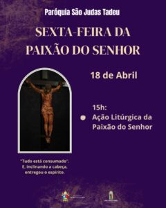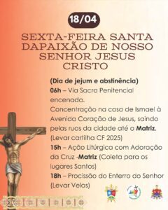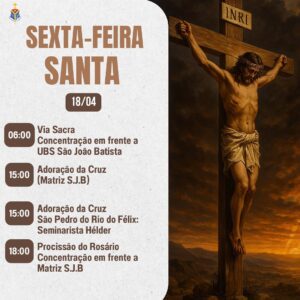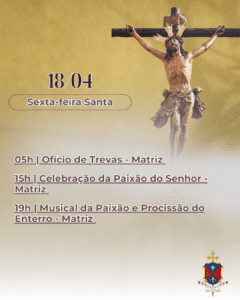 A Sexta-feira Santa da Paixão do Senhor é um dia de jejum, abstinência e recolhimento. A Igreja se reúne para meditar a Paixão de Cristo, adorar a cruz — símbolo do amor redentor — e comungar do Corpo do Senhor, consagrado na noite anterior. É a única data do calendário litúrgico em que não se celebra a Missa. Em muitas comunidades, também é realizada a tradicional procissão do Senhor Morto, um momento de oração e reflexão sobre o sacrifício de Jesus pela salvação da humanidade.