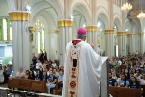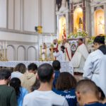 Durante a homilia, Dom José também dirigiu palavras especiais aos universitários, refletindo sobre o valor do saber e da razão. “O saber não está na contramão da fé. A razão não está na contramão da fé”, afirmou, sublinhando que a racionalidade humana deve estar a serviço da vocação maior: a de sermos santos. Relembrando o pensamento de Teilhard de Chardin, completou: “Não somos seres humanos vivendo uma experiência espiritual, mas seres espirituais vivendo uma experiência humana.”